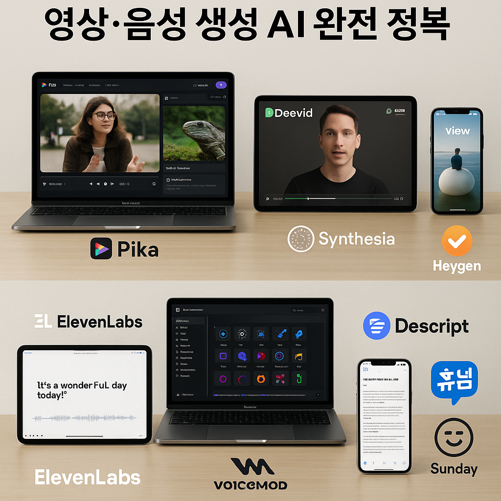 Pika, Runway, Deevid, View, HeyGen, Synthesia, ElevenLabs, Voicemod, Descript, Sunday, 하이로우…