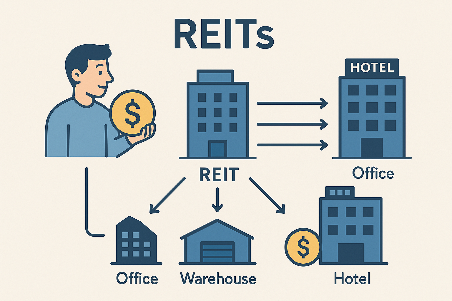 - 리츠는 오피스·물류센터·호텔·리테일몰 등 다양한 부동산 자산에 투자한다.